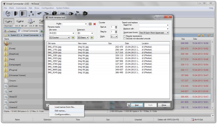 Dazu gehören die Unterstützung des Unicode-Zeichensatzes, eine erweiterte Datei-Suche und ein Werkzeug, mit dem ihr mehrere Dateien auf einmal umbenennen könnt. Auch ist es mit dem Unreal Commander Download möglich, Verzeichnisse zu synchronisieren.