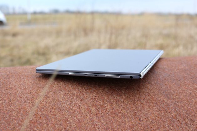Die Lautsprecher, die Lautstärkeregelung und der Power-Button wurden ebenfalls an den Seiten untergebracht. Der Klang ist gut und die Lautstärke sehr hoch. Die Knöpfe heben sich durch eine andere Farbe schön ab und besitzen einen angenehmen Druckpunkt. Suchen mussten wir diese beim Test des Lenovo Yoga Book aber häufiger.