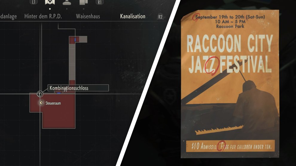 Der letzte Spind mit Kombinationsschloss steht im Steuerraum der oberen Kanalisation. Den Hinweis auf den Code gibt euch ein Pamphlet zum „Raccoon City Jazz Festival“ im Arbeiter-Pausenraum (Oben). Hier sind die drei richtigen Buchstaben rot eingekringelt. Sie lauten: SZF.